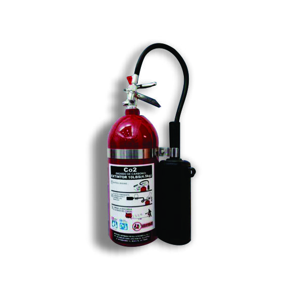 Extintor portátil de presión contenida, a base de Bióxido de Carbono (CO2), para tipo de fuego BC, fabricado en duraluminio en una sola pieza.