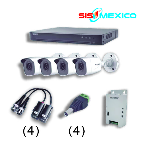 KIT TurboHD 1080p / DVR 4 Canales / 4 Cámaras Bala Metálicas (exterior 2.8 mm) / Transceptores / Conectores / Fuente de Poder Profesional