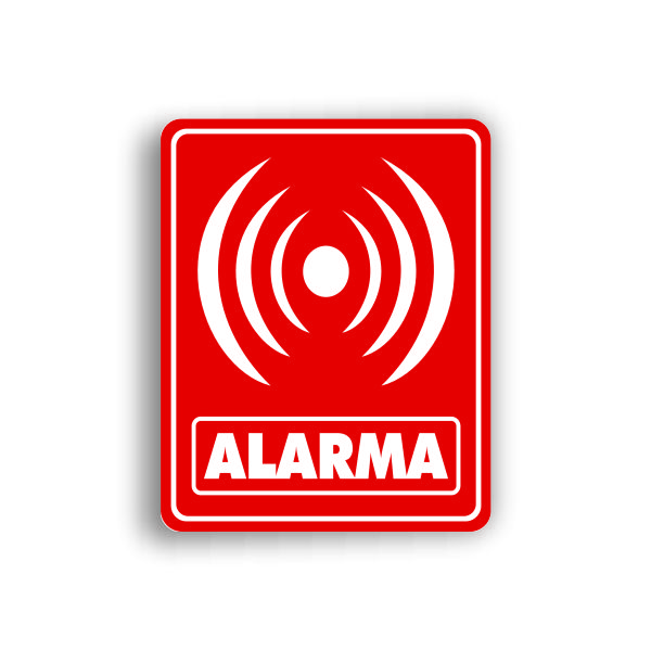 Señalamiento fondeado en vinil con leyenda «Alarma» en medidas de 35 x 50 cm, fabricado con Estireno cal. 40.
