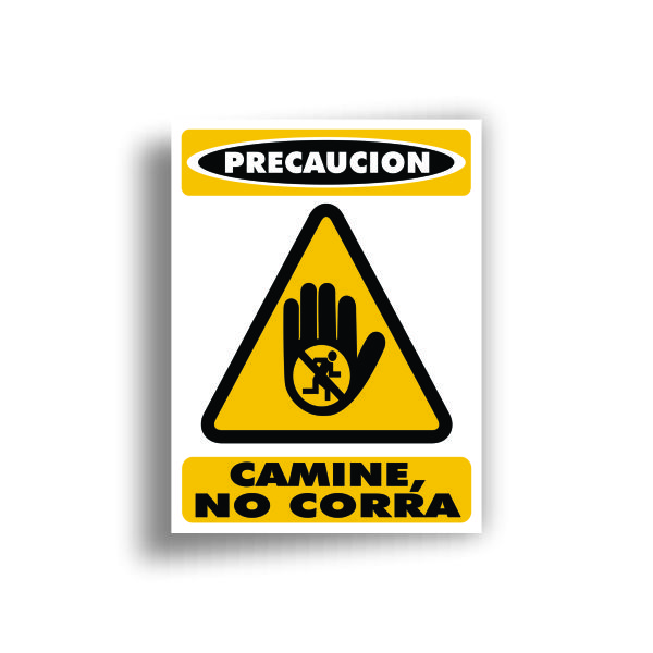 Señalamiento fondeado en vinil con leyenda «Camine no corra» en medidas de 30 x 35 cm, fabricado con Estireno cal. 40.