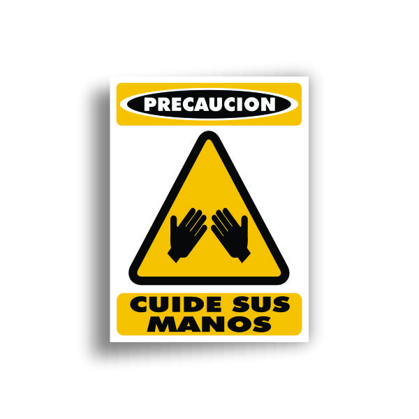 Señalamiento fondeado en vinil con leyenda «Cuide sus manos» en medidas de 30 x 35 cm, fabricado con Estireno cal. 40.