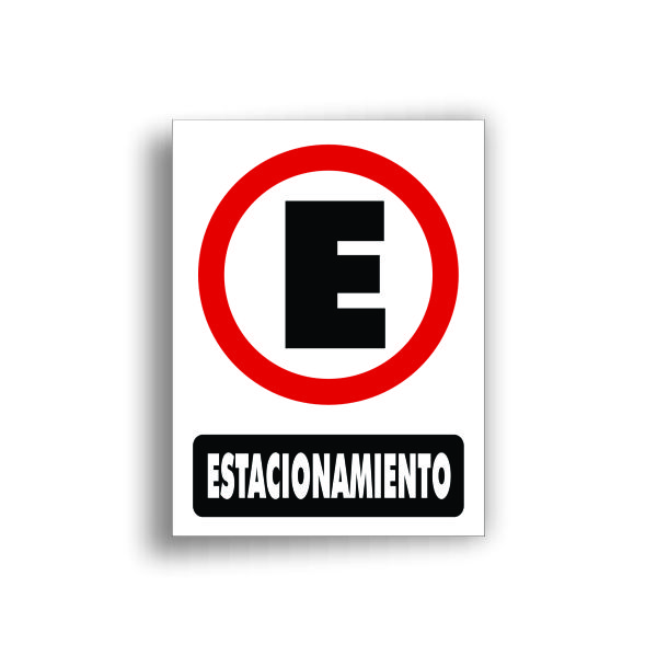 Señalamiento fondeado en vinil con leyenda «Estacionamiento» en medidas de 30x 35 cm, fabricado con Estireno cal.40.