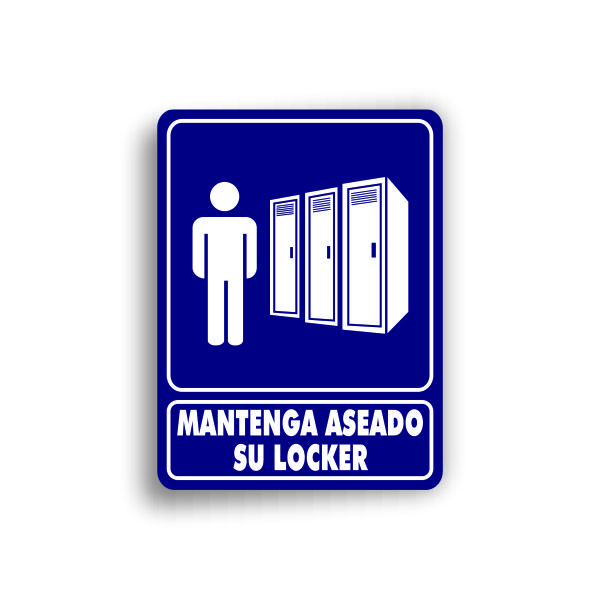 Señalamiento fondeado en vinil con leyenda «Mantenga aseado su locker» en medidas de 35 x 50 cm, fabricado con Estireno cal. 40.