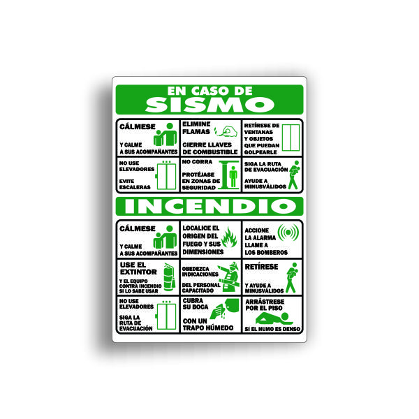 Señalamiento fondeado en vinil con leyenda «Que hacer en caso de sismo e incendio» en medidas de 45 x 60 cm, fabricado con Estireno cal. 40.