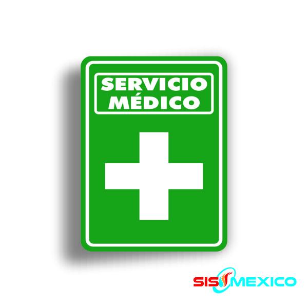 Señalamiento fondeado en vinil con leyenda «Servicio Médico» en medidas de 35 x 50 cm, fabricado con Estireno cal. 40.
