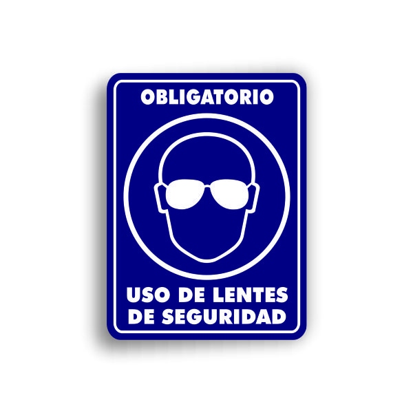 Señalamiento fondeado en vinil con leyenda «Uso de lentes de seguridad» en medidas de 30 x 35 cm, fabricado con Estireno cal.40.