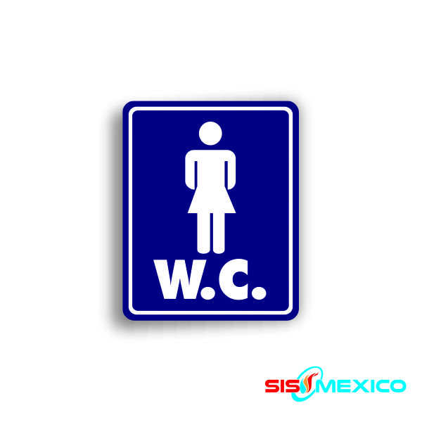 Señalamiento fondeado en vinil con leyenda «W.C. mujeres» en medidas de 35 x 50 cm, fabricado con Estireno cal. 40.