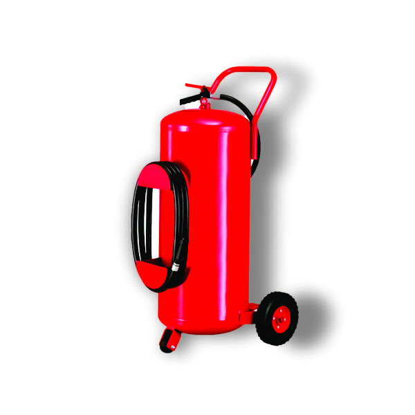 Extintor tipo UNIDAD MÓVIL ABC de presión contenida, cargada con Polvo Químico Seco, acabado en color rojo, fabricado en lámina de acero cal. 12.